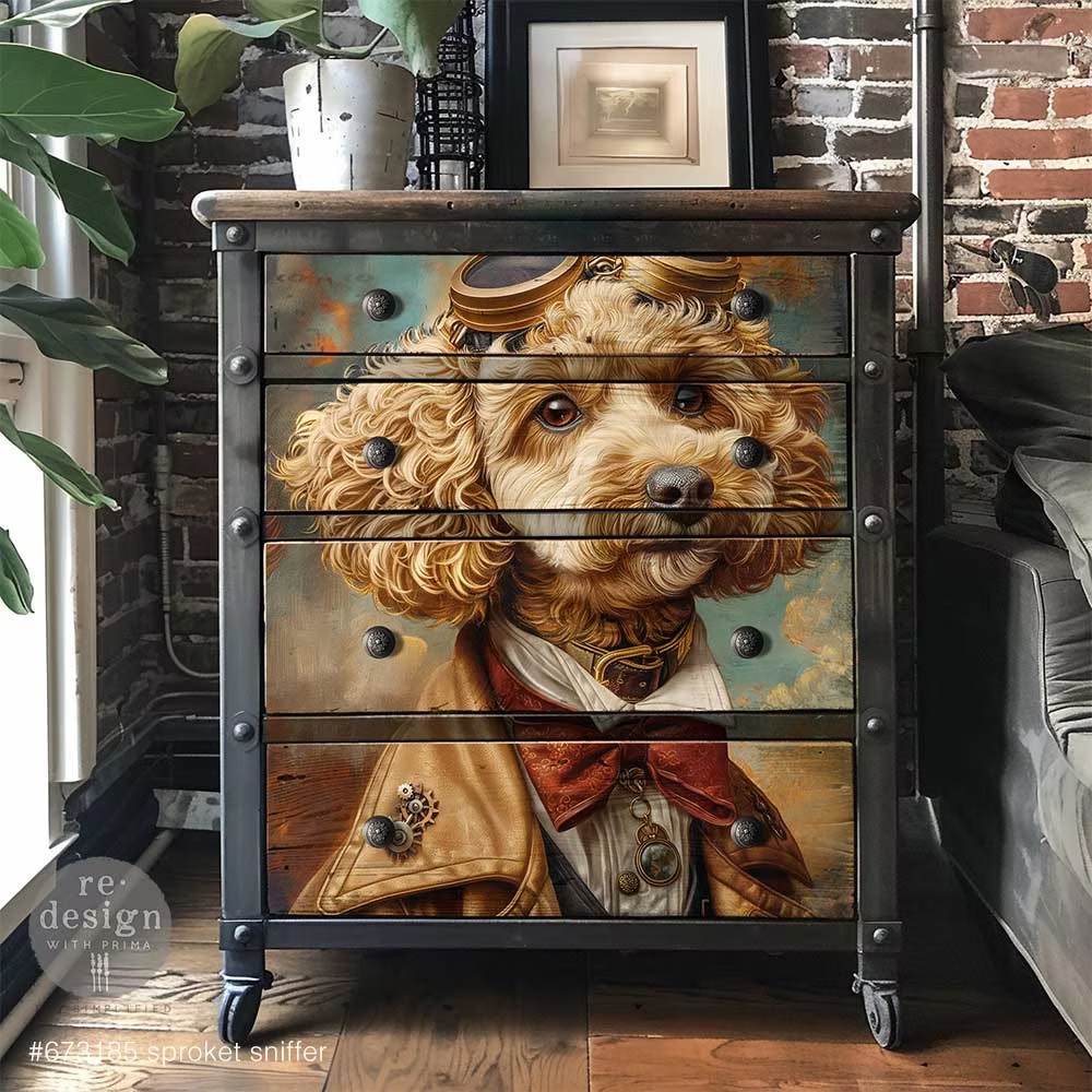 Ready for an adventure? “Sprocket Sniffer” Decoupage Fiber Paper by Redesign with Prima® is here to lead the way! This charming decoupage fiber features an adorable dog dressed in full steampunk regalia, complete with goggles and gears. Perfect for pet lovers and steampunk aficionados, this piece adds a playful and adventurous spirit to your decor. Let this dashing pup be the co-pilot to your creativity!
