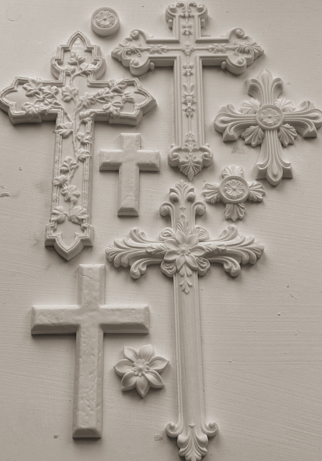 We’ve wanted a cross mould for quite some time (and yes, we heard your requests). The 6x10” Les Croix Mould is our answer—gathering these ornamental designs into one beautifully detailed mould. The collection includes a mix of architectural ornament–style crosses, a botanical cross with raised leaves, and simpler forms that give makers a range of silhouettes to work with. Smaller coordinating pieces like medallions and flourished accents make it easy to build layered compositions or add subtle touches to a project.